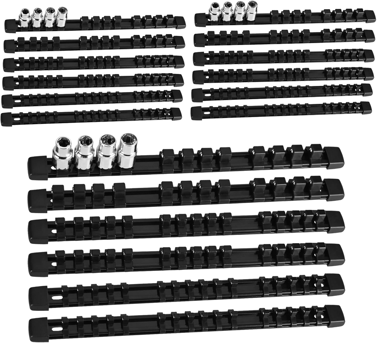 【Included Size】6PCS 1/4 socket organizer drive, holds 96 sockets, 6PCS 3/8 socket organizer drive, holds 90 sockets, 6PCS 1/2 socket organizer drive, holds 72 sockets. Socket rail set holds up to 258 sockets. Socket rail length is 14.1 inch,width is 1 inch.