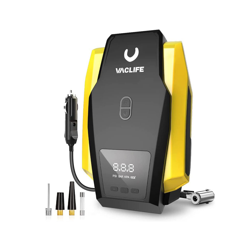 [MULTIPURPOSE NOZZLES] VacLife tire pump is equipped with 3 additional nozzles besides the original. A wider applying range to cover various needs for inflatables such as vehicle tires and sports or entertainment equipment including compact or midsize Sedan, SUV, ATV, bike, motorcycles, air mattress, inflatable boats, balls.
