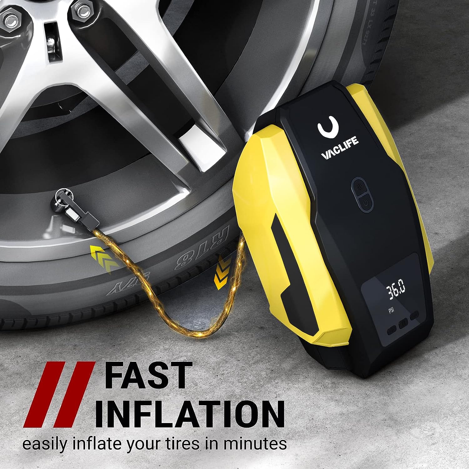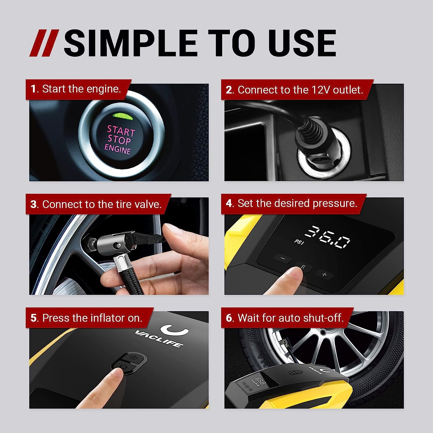 [AUTO SHUT OFF] Simplicity meets functionality. VacLife car air pump provides you with rest-assured using experience based on the auto-shut off function. Preset the desired pressure level and start inflating job. The car air compressor will shut off automatically at the desired level. There is no need to worry about over inflating, VacLife smart inflator for tires got your back.